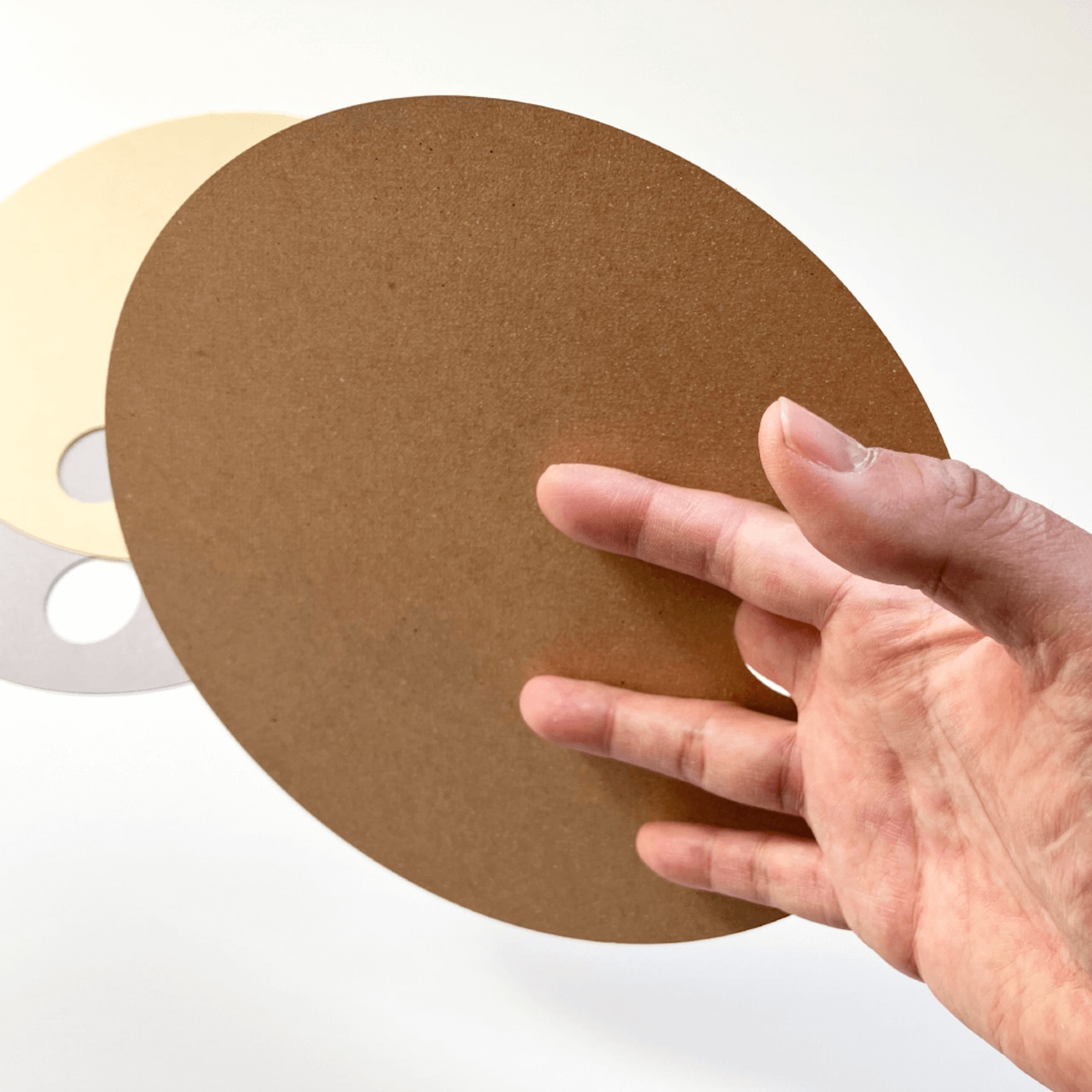 印刷屋の裏側に眠っていた特殊紙を丸くかたどり、うちわに仕立てました。