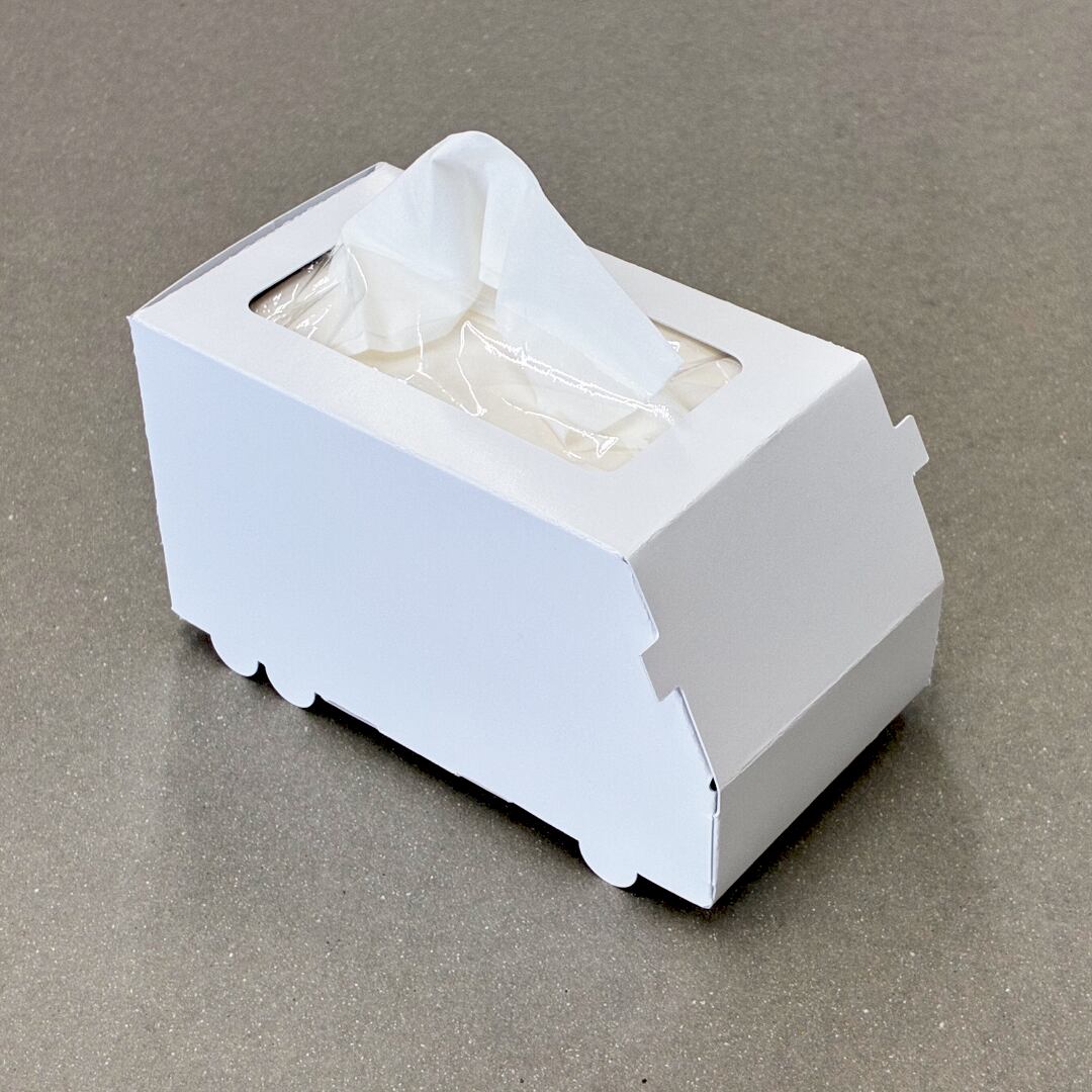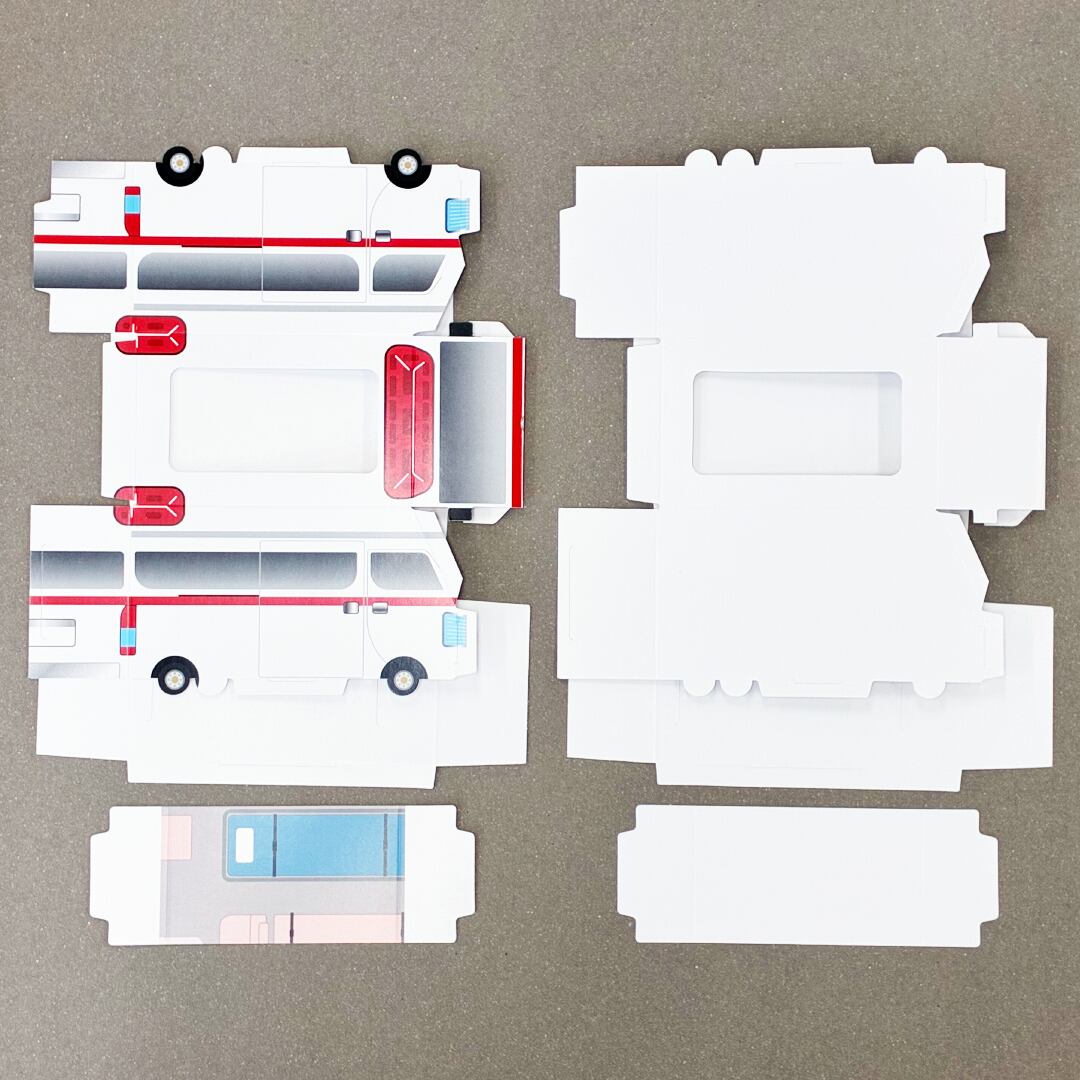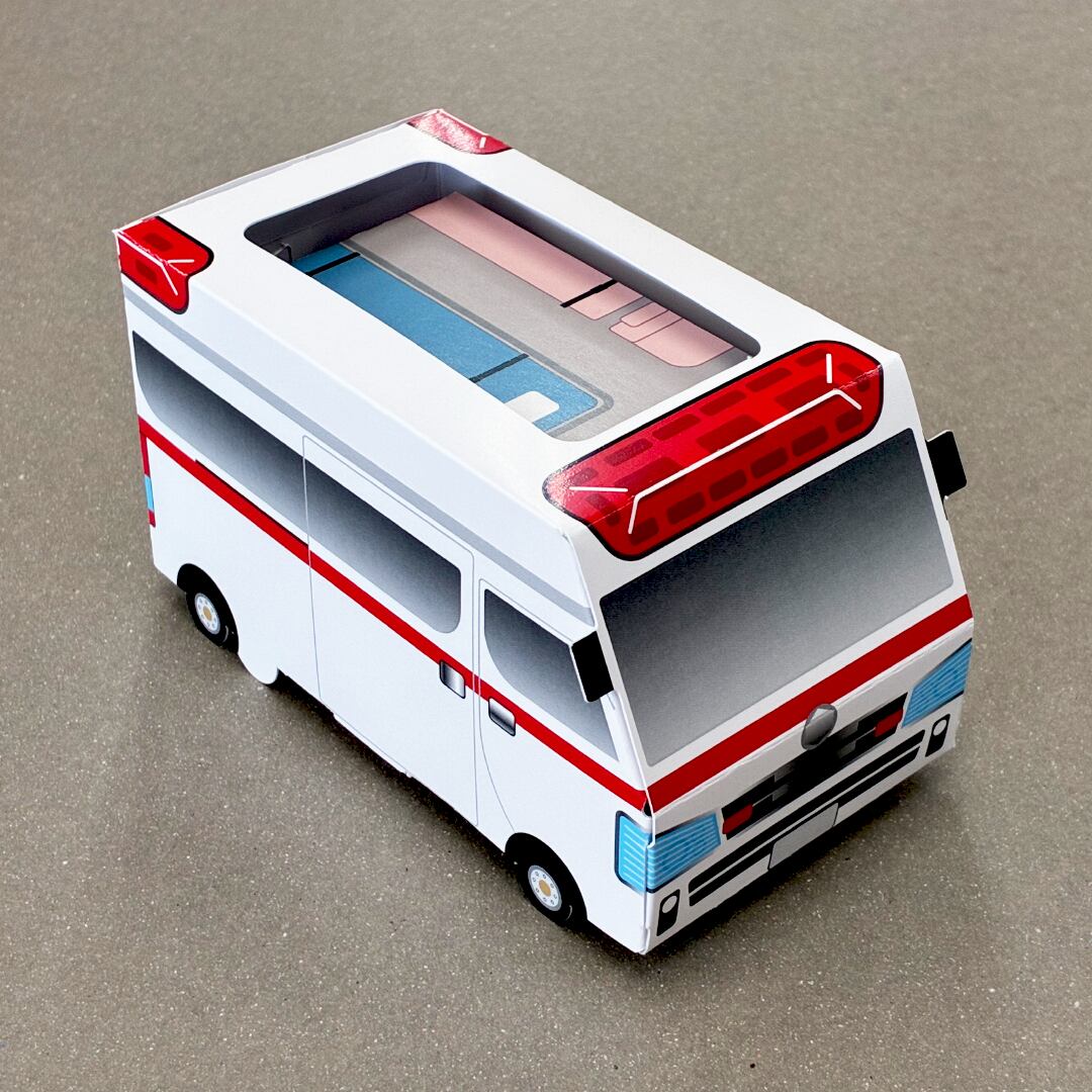 可愛らしい救急車デザインのポケットティッシュボックスをお届けします!お子様との工作もできて実用的。無地バージョンも1枚入っているのでお絵描きしてオリジナルのティッシュボックスにも出来ちゃう!